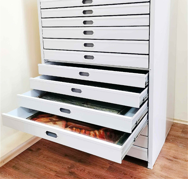 Каждый ящик обеспечивает индивидуальное пространство для иконы, защищая её от пыли, повреждений и неблагоприятных условий окружающей среды. Выдвижная конструкция ящиков позволяет легко и быстро получить доступ к любой иконе, что особенно удобно для осмотра или реставрации.