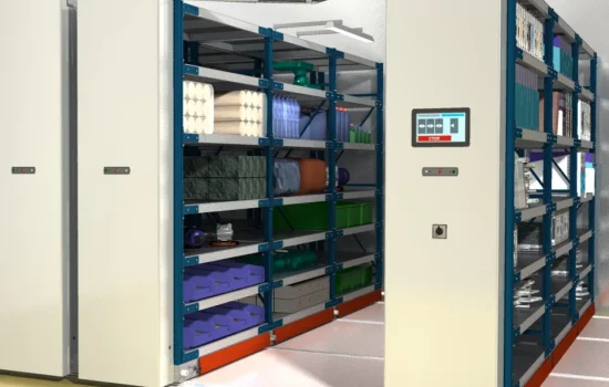 Среднегрузовые передвижные стеллажи закрывающиеся дверями жалюзи для склада, цеха или производства.